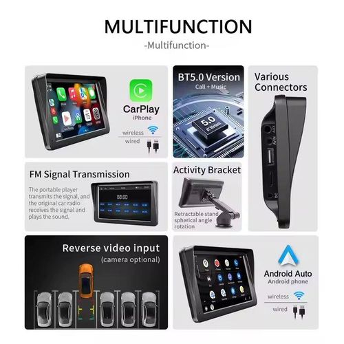 Autoradio universel / Lecteur Multimédia Tactile 7 Pouces Cartouche Carte Sans Fil - Les points forts : Type de façade : tactile portable 7 pouces Normes numériques audio prises en charge : WIFI,USB,FM,Mobile iPhone/Android, Source de contenus multimédias : CarPlay port cartes TF,USB (audio/vidéo/image) Fonctions Bluetooth Fonction de mise en miroir de l’écran du téléphone filaire ; prend en charge Android Auto et CarPlay filaire/sans fil Lien miroir (filaire) Prise en charge des systèmes Android et iOS Grâce à la connexion par câble de données, la même fonction d’écran du téléphone mobile la navigation peut être réalisée. Il peut cartographier des fonctions telles que la musique de la carte du téléphone dans le téléphone portable à la navigation CarPlay CarPlay vous permet d’utiliser intelligemment et en toute sécurité les fonctionnalités de l’iPhone pendant la conduite.